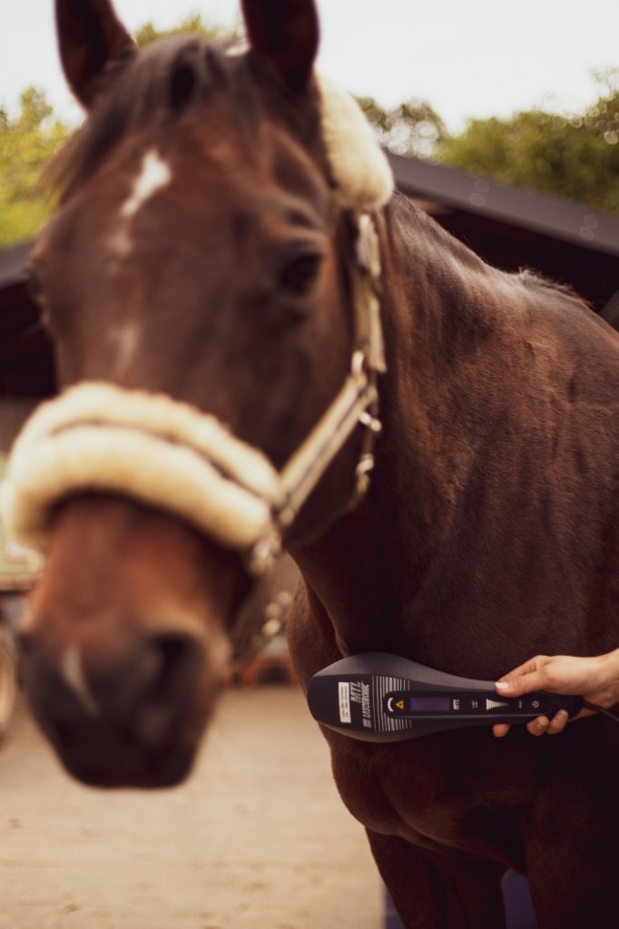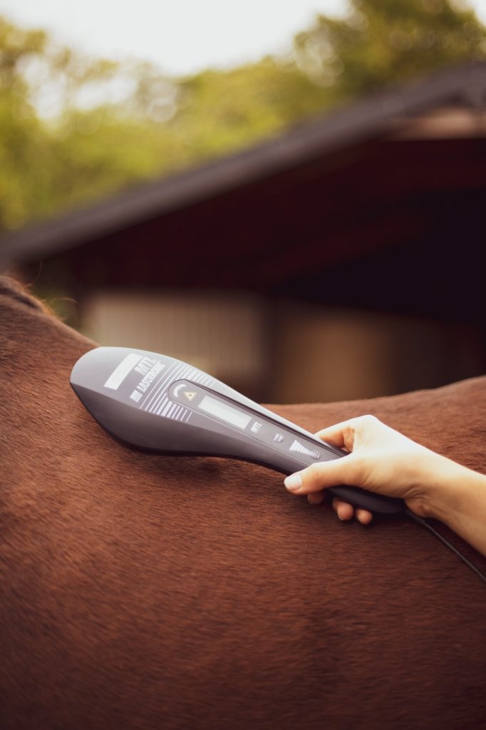 Ebenso steht eine Laserlicht-Frequenz-Gamasche speziell für Erkrankungen der Pferdebeine zum Ausleihen zur Verfügung. Je nach Indikation genügt die alleinige Anwendung der Gamsche oder sie kann die Behandlung des Lasers zwischen den Terminen unterstützen oder die Termin-Intervalle vergrößern.