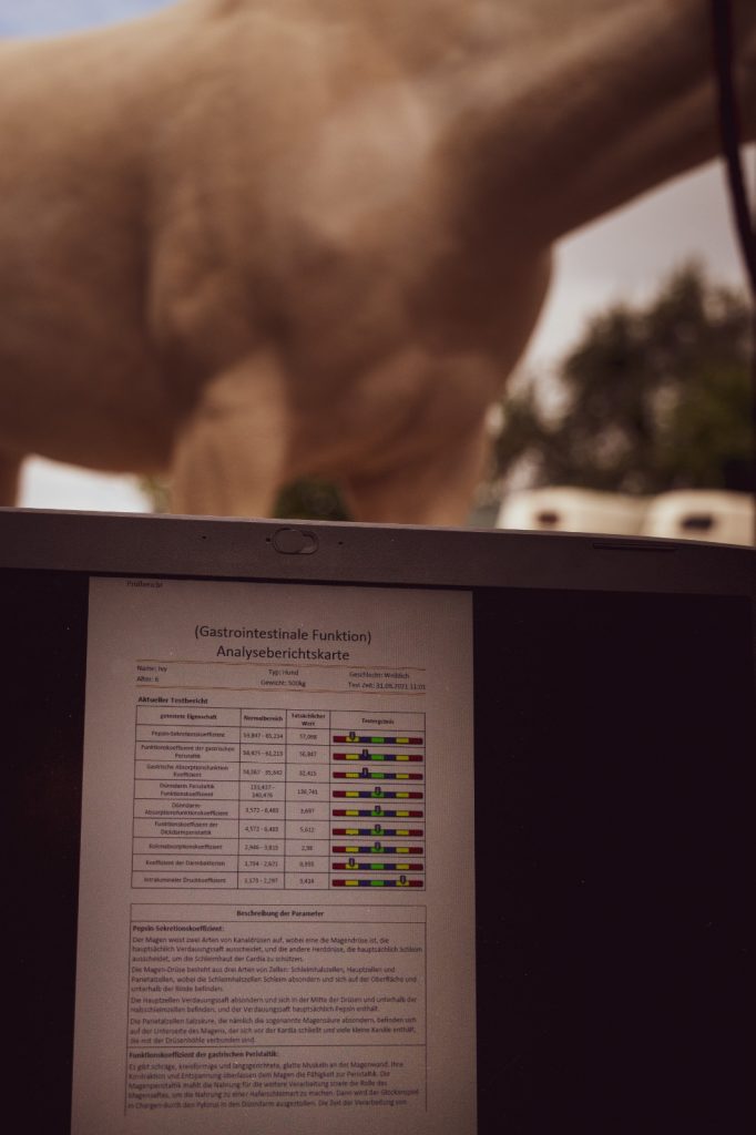 Die Messung erfolgt über zwei Elektroden, die für ca. 60 Sekunden am Tier befestigt werden. Im Anschluss zeigt die Software die Abweichungen für 110 Gesundheitsparameter in übersichtlichen Diagrammen an, die ich auch als PDF zur Verfügung stellen kann.